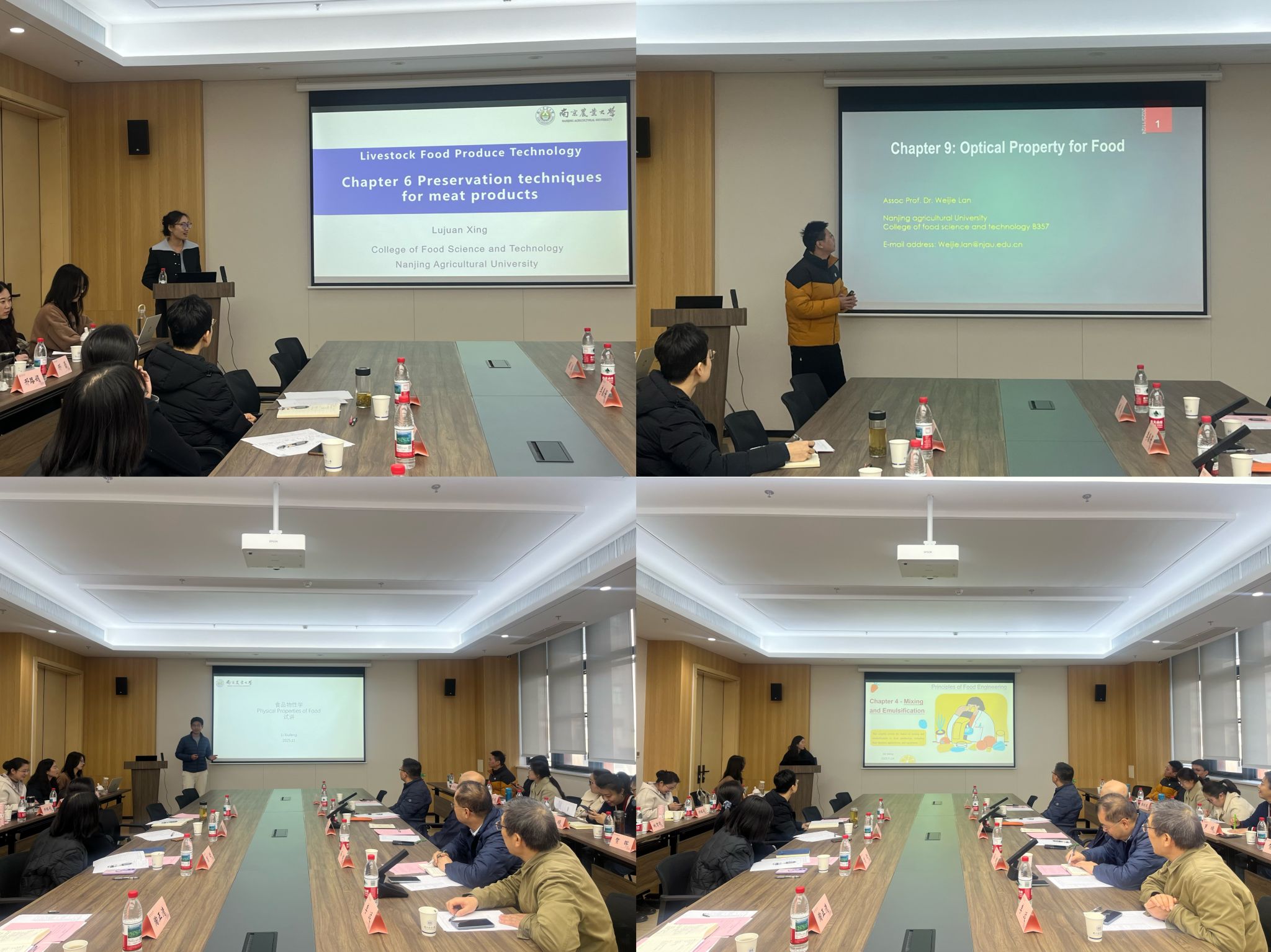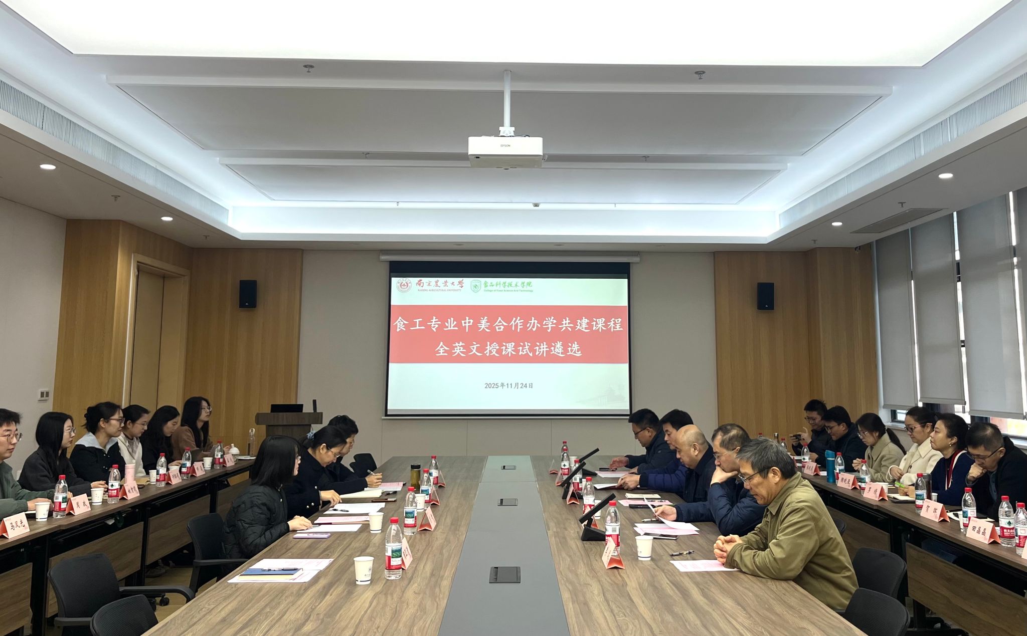 2025年11月24日上午,南京农业大学食品科技学院在滨江校区顺利举办“食工专业中美合作办学共建课程全英文授课试讲遴选会”。国际合作与交流处处长石松、食品科技学院党委书记孙健、院长李春保、副院长胡冰、李远出席会议,5位评委及15位青年教师参与试讲。会议由胡冰副院长主持。